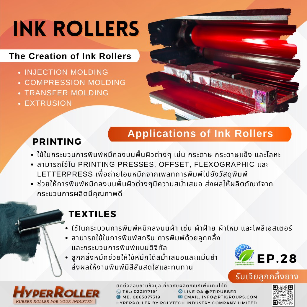 HyperRoller™ เราบริการรับผลิต-หล่อลูกกลิ้งยางRubber Ink Roller หรือ Rubber Printing Rollerตามแบบ Spec. การใช้งาน พร้อมด้วยวัตถุดิบยางที่มีบริการให้ท่านเลือก เช่น Silicone , NBR , NR , HNBR , CR (Neoprene) , CSM , FKM , PU etc. สนใจผลิตภัณฑ์สอบถามเพิ่มเติมได้ที่แบรนด์ HyperRoller